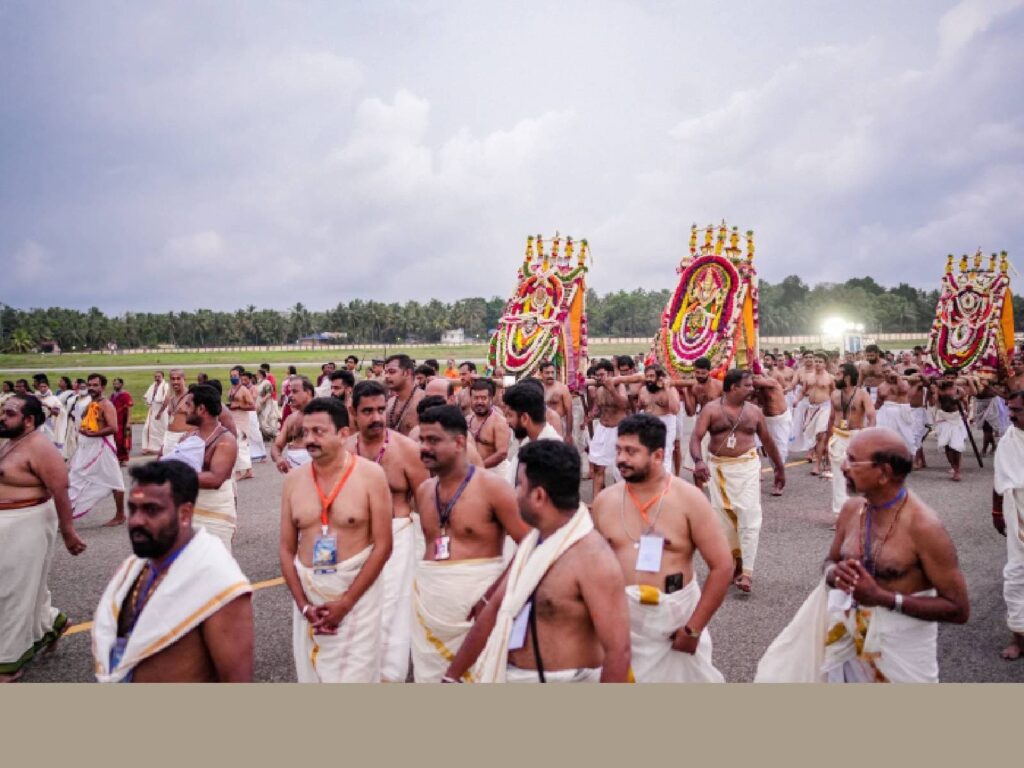 కేరళ రాజధాని తిరువనంతపురం అంతర్జాతీయ విమానాశ్రయంపైన ఆకాశంలో నిశ్శబ్దం ఆవరించింది. ఏప్రిల్ నెలలో ఒకరోజు ఆ ఎయిర్పోర్టులో కొన్నిగంటల పాటు విమానాల రాకపోకలు ఆగిపోయాయి. వాతావరణం అనుకూలంగా లేకపోవడమో, లేదా సాంకేతిక కారణాల వల్లో విమానాశ్రయం మూతపడలేదు, ఎయిర్పోర్టులోని రన్వే మీదుగా పద్మనాభస్వామి ఊరేగింపు వెళ్లడం కోసం ఈ ఏర్పాట్లు చేశారు. చెక్కరథాలపై, అలంకరించిన ఉత్సవమూర్తులను ఉంచి, రెండు కిలోమీటర్ల రన్వేపై ఊరేగింపుగా తీసుకెళ్తారు భక్తులు.