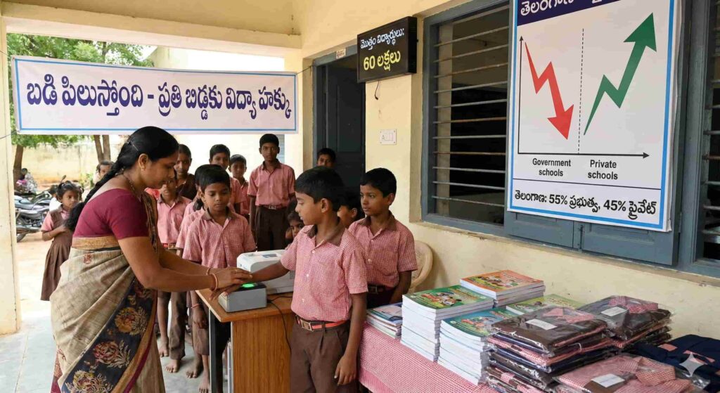 డిజిటలీకరణలో భాగంగా ఉపాధ్యాయులు, విద్యా ర్థుల హాజరు వేలిముద్రల ద్వారా నమోదు చేస్తున్నారు. ‘బడి పిలుస్తోంది’ అనే ప్రచార కార్యక్రమం ద్వారా విద్య అనేది ప్రతి బిడ్డకు హక్కు అని ప్రజల లో అవగాహన కల్పించడం, ఉచితంగా మధ్యాహ్న భోజనం, ఏకరూప వస్త్రాలు, పుస్తకాలు అందిస్తున్నారు. తెలంగాణలోని మొత్తం 26,101 ప్రభుత్వ పాఠశాలలు ఉండగా ఇందులో 1,06,641 లు పనిచేస్తున్నారు. తెలంగాణ లో సుమారు 60 లక్షల మంది పాఠశాల విద్యాభ్యాసం చేస్తుంటే 35 లక్షలమంది పిల్లలు ప్రభుత్వ పాఠశాలల్లోనూ, 25 లక్షలమంది ప్రైవేటు పాఠశాలల్లోనూ విద్యా భ్యాసం చేస్తున్నారు. గత పది సంవత్సరాలతో పోలిస్తే ప్రతి సంవత్సరం సుమారు 3 శాతం మంది చొప్పున ప్రభుత్వ పాఠ శాలల్లో పిల్లల సంఖ్య తగ్గుతూ వస్తుంది. 10 సంవత్సరాల క్రితం ప్రభుత్వ పాఠశాలల్లో 87 శాతం పిల్లలు ఉంటే ప్రైవేటు పాఠశాలల్లో 13 శాతం పిల్లలు ఉన్నారు. నేడు సుమారు 55 శాతం మంది పిల్లలు ప్రభుత్వ పాఠశాలల్లో ఉంటే ప్రైవేటు పాఠశాలల్లో 45 శాతం మంది పిల్లలు ఉన్నారు. తెలంగాణలోని 272 పాఠశాలల్లో 501 నుంచి 750 మధ్య పిల్లలు ఉండగా, 85 పాఠశాలల్లో 750 మంది. విద్యార్థులు ఉన్నారు. ఇదిలా ఉండగా కేవలం ఒక్క విద్యార్థి మాత్రమే చేరిన పాఠశాలల సంఖ్య 53 ఉండగా, టీవర్లు 51 మంది ఉన్నారు. అలా ఈ విద్యాసంవత్సరం. లో పది మందిలోపు విద్యార్థులు చేరిన పాఠశాలలు మొత్తం 4324 ఉన్నాయి.