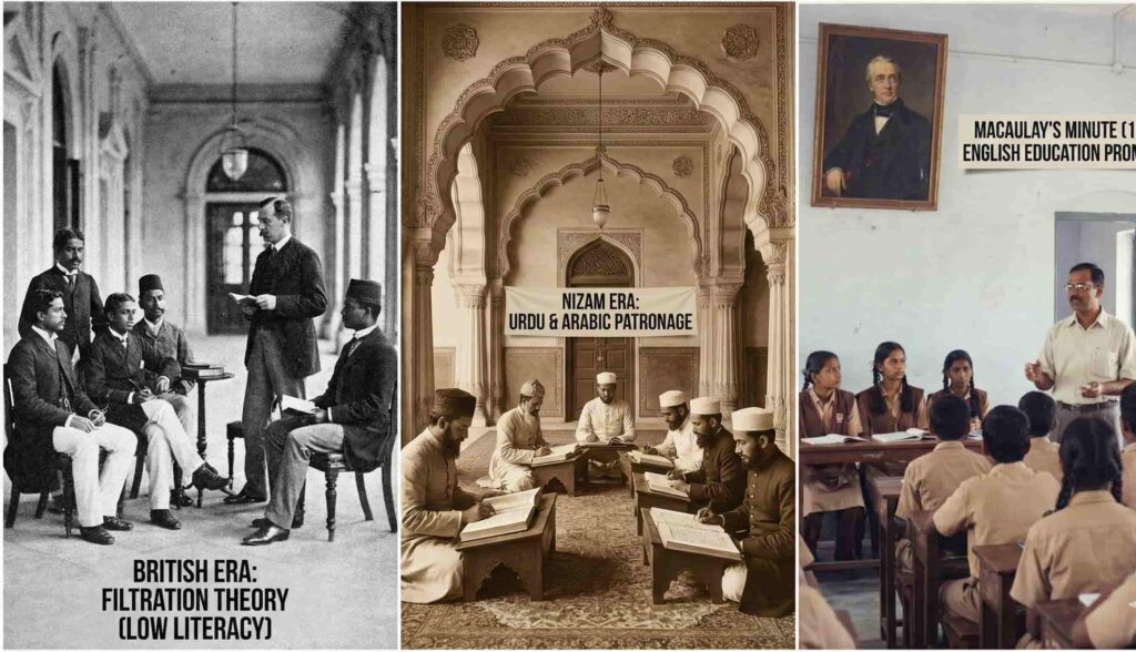 అయిన ప్పటికీ వారు భారత దేశాన్ని వదిలే సమయానికి మనదేశంలో అక్షరాస్యత పది శాతం కూడాలేదు. దీనికికారణం వారు పాటిం చిన ఫిల్టరు పద్ధతి అని చెప్పవచ్చు. ఈ పద్ధతి ద్వారా పై తర గతి వారికి విద్యాబోధన చేసేవారు కింది తరగతివారికి చదువు నేర్పుతారు అని భావించడం జరిగింది. అది ఆచరణలో విఫల మైంది. ఆ మీదట నిజాం కాలంలోని విద్యావ్యవస్థ గురించి మనకు చాలా ఆధారాలు ఉన్నాయి. ఆ కాలంలో తెలుగు భాష ద్వారా విద్యావ్యాప్తికి బొత్తిగా రాజాశ్రయం లేదని తెలుస్తున్నది. ఆధునిక విద్య ఆ రోజులలో కొందరు చక్రవర్తులు సహాయ సహకారాలు అందించడం వల్ల అరబిక్, ఉర్దూ భాషల మనుగడ కొన సాగింది. అనంతరం ఆంగ్లేయులు ఆంగ్ల భాషకు పెద్ద పీట వేశారు. తరువాత వచ్చిన గ్రంథాలయోద్యమం వంటి అనేక ఉద్యమాల వల్ల ఎక్కువ మంది ప్రజల మాతృభాష అయిన తెలుగు ద్వారా విద్యావ్యాప్తికి ప్రయత్నాలు జరిగాయి. బ్రిటిష వారు అధికారాన్ని ఏకీకృతం! చేయడంతో, దేశాన్ని పరిపాలిం చడంలో ఆంగ్ల భాష చాలా ఉపయోగపడుతుందనే విషయాన్ని బ్రిటిష్ వారు గుర్తించారు. భారతదేశంలో విద్య పరిణామంలో ముఖ్యమైన మైలురాళ్లలో ఒకటి 1835లో లార్డ్ థామస్ బాబింగ్టన్ మెకాలే మినిట్ ఆన్ ఎడ్యుకేషన్ ను ప్రవేశపెట్టడం అని చెప్పవచ్చు. పాశ్చాత్య విద్య ను, ప్రత్యేకంగా ఆంగ్ల భాష, సాహిత్యాన్ని ప్రోత్సహించడాన్ని మెకాలే నొక్కిచెప్పారు. దాంతో మెకాలే కాలంలో ఆంగ్ల విద్యకు పాఠ ర్థుల దృ ప్రాధాన్యత పెరిగింది.