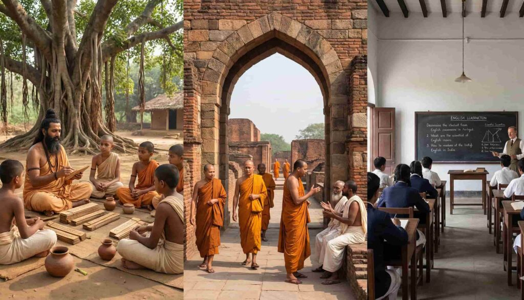 ప్రాచీన కాలంలో విద్య క్రీస్తు పూర్వం 1400 నుండి క్రీస్తు పూర్వం 600 వరకూ గల కాలంలో విద్య అనేది పూర్తిగా మతపరమైనదిగానే సాగింది. ఆ తరువాత బౌద్ధ మతం వచ్చాక విద్యా వ్యవస్థలో కొన్ని మార్పు లు జరిగాయి. విద్య గురుకులాలనుండి ఆరామాలకు చేరుకున్న ది. బౌద్ధ ఆరామాలలో చాలా మంది గురువులు ఉండి ఇప్పటి మన విశ్వవిద్యాలయాలలాగా బోధన చేసేవారు. ఈ తరుణం లోనే ప్రపంచ ప్రఖ్యాత విశ్వవిద్యాలయాలు అయిన నలందా విశ్వవిద్యాలయం, తక్షశిల విశ్వవిద్యాలయాలు వచ్చాయి. అనం తరం విద్యాబోధన సంస్కృతం నుండి ప్రజాభాషకు వచ్చింది. తదుపరి ముస్లిం పాలకులు, హిందూ రాజులు విద్యా వ్యవస్థ లో అనేక మార్పులు చేశారు. బ్రిటిషు పాలకుల కాలంలో భారతదేశ విద్యావ్యవస్థలో విప్లవాత్మకమైన మార్పులు వచ్చాయి. ముఖ్యంగా రెండు మార్పులు చెప్పు కోవాలి. అప్పటివరకూ ఎన్ని మార్పులు జరిగి భారతదేశంలో విద్యావ్యవ హిందూ, బౌద్ధ, ఇస్లాం ఇత్యాది మతాల ప్రభావం ప్రధానమైనదిగానే ఉండేది. కానీ బ్రిటిషువారు వచ్చిన తరువాత భౌతిక విద్యయ ప్రాధాన్యం పెరిగింది. మత విద్యను అభ్యసించడం మానేసి ప్రజలు సైన్సు చదవడం మొదలు పెట్టి భాషకు ప్రాముఖ్యత పెరిగింది. బ్రిటిషు వారి విద్యావిధానంలో ఎన్నో కమిటీలు వేశారు. ఎన్నో సంస్కరణలు తెచ్చే ప్రయత్నం చేశారు.