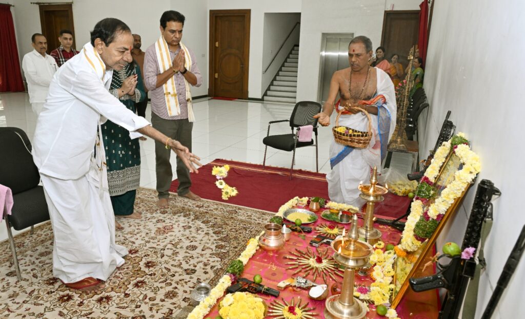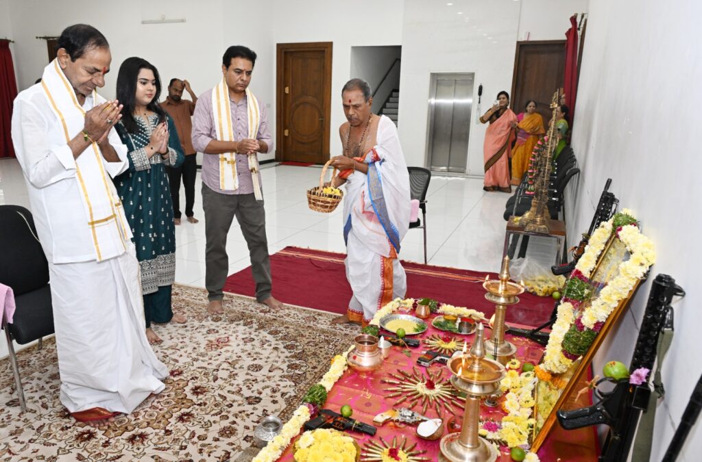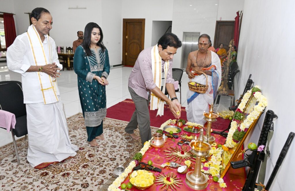 ఎర్రవెల్లిలోని నివాసంలో గురువారం జరిగిన పూజా కార్యక్రమంలో కేసీఆర్ KCR దంపతులు , బి.ఆర్.ఎస్ వర్కింగ్ ప్రెసిడెంట్ కేటీఆర్ దంపతులు , కుటుంబ సభ్యులు , సిబ్బంది పాల్గొన్నారు.