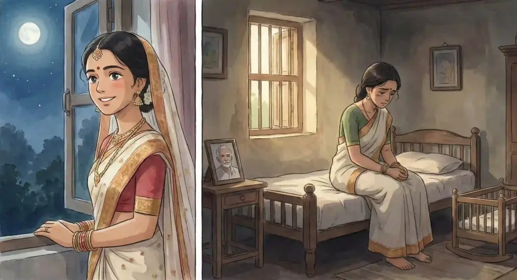 అభ్యంతరం చెప్పడానికి ఏమీ లేకపోవడంతో కృష్ణవేణి తండ్రి “అమ్మా! నువ్వేమంటావు?” అన్నాడు కూతురితో. ఆమె నవ్వుతూ తన అంగీకారం తెలిపింది. అంతకన్నా ఆలోచించే వయసు ఆమెకు లేదు. కృష్ణవేణి పెళ్లితంతు ముగిసి ఆనందంగా అత్తగారింట్లోకి అడుగు పెట్టింది. పెద్ద కుటుంబంలోకి వచ్చానన్న ఆనందం ఆమెను నిలువనీయడం లేదు. వైవాహిక జీవితం గురించిన ఆమె కలలు మొదటి రాత్రే కల్లలయ్యాయి, శోభనం పెళ్లికూతురు మధురమైన ఊహలతో బెడ్రూంలో భర్త రాకకై ఎదురు చూస్తూనే నిద్రపోయింది. అర్థరాత్రివేళ తప్పతాగి మాట్లాడే పరిస్థితిలో కూడా లేని రాజేన్ని చూసి కృష్ణవేణి నిర్ఘాంతపోయింది. మర్నాడు అత్తమామలు “అన్నీ సర్దుకుంటాయి, నువ్వు మా ఇంటి మహాలక్ష్మివి. కంగారు పడకు” అని ధైర్యం చెప్పారు. కానీ అది జరగలేదు. రాజేష్ కృష్ణవేణితో ప్రత్యేకించి మాట్లాడడు. రోజూ తాగి రావడం, పలకరిస్తే తిట్టడం, అదేమిటని నిలదీస్తే కొట్టడం. వారాలు, నెలలు గడుస్తున్నా ఈ పరిస్థితిలో మార్పు లేదు. చిన్న వయసు, ఎన్నో బాధలు, ఏదైనా చెప్పుకుందామన్నా అమ్మలేదు. తోడబుట్టినవాళ్లు లేరు. పోనీ నాన్నకు చెప్పుకుందామా అంటే అప్పటికే ఆయన అనారోగ్యం బారిన పడ్డాడు. మరికొన్ని నెలలలో మరణించాడు. ఈ పరిస్థితిల్లోనే కృష్ణవేణికి ఆడపిల్ల పుట్టి పురిటిలోనే చనిపోయింది. కాలక్రమేణా “అత్తమామలు స్వతహాగా మంచివారే. అయినా కొడుక్కి చదువు ఒంటబట్టకపోవడం, చెడు సహవాసాలు, సకల దురలవాట్లు ఉండడంతో వివాహం చేస్తే మార్పు వస్తుంది ఈ పెళ్లి చేసారు” అని ఆలస్యంగా తెలుసుకుంది.