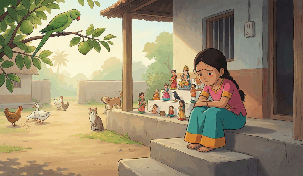 ఇంటి చుట్టూ ప్రహరీ ఉండడంతో బయటివారు తీసే అవకాశం లేదు. బొమ్మ పోవడంతో ఏడుపు వచ్చింది కావ్యకు. అటుగా పిల్లి వెళుతుంటే ‘కాకి బొమ్మను తీసావా?’ అని అడిగింది కావ్య. ‘పాలు తాగుతాను. ఎలుకల్ని తింటాను కానీ బొమ్మ నాకెందుకు.’ అంది పిల్లి. పిల్లిని చూసి కంతలోకి దూరుతున్న ఎలుకను ‘నువ్వు తీసావా?’ అని అడిగింది కావ్య. ‘తినే వస్తువు కావాలి కానీ బొమ్మ ఏమి చేసుకుంటాను?’ అనేసి దాక్కుంది కావ్య. ‘అన్నము, మాంసం ముక్కలు కావాలి. బొమ్మ నాకెందుకు?’ అంది కుక్క, కోడి, బాతులనీ అడిగింది. అవి తియ్యలేదని చెప్పాయి. కావ్య ఉసూరుమంటూ కూర్చుంది. దొడ్లో ఉన్న జామచెట్టు మీద ఒక చిలుక వాలి కావ్యను పలకరించింది. దాని మాటలకు ఉత్సాహం వచ్చింది కానీ బొమ్మపోయిన బాధను దాచుకోలేకపోయింది కావ్య. జరిగిందంతా చిలుకతో చెప్పింది. ‘నీ స్నేహితులే తీశారేమో’ అంది చిలుక. ‘లేదు. అడగకుండా తీయరు. మేము ఆడుకుంటూవుండగా ఒక కాకి బొమ్మల్ని చాలాసేపు చూసింది.అది తీసిందంటావా’ అని అడిగింది. కావ్య, ఆ కాకి ఆనవాళ్లని కూడా అడవిలో ఉన్న కాకి నువ్వు చెప్పినట్టే ఉంటుంది. దాన్ని చెప్పింది చిలుకతో. ‘ఇక్కడకు పక్కనే మా ఆడవి. మా కి అడుగుతాను’ అనేసి ఎగిరిపోయింది చిలుక. అడవికి వెళి కాకిని అడిగింది కానీ తెలియదని అది చెప్పడంతో పక్షిరాజుని కలసి జరిగిందంతా చెప్పింది చిలుక. ‘నా కెందుకో కాకి మీద అనుమానం ఉంది’ అంది చిలుక.