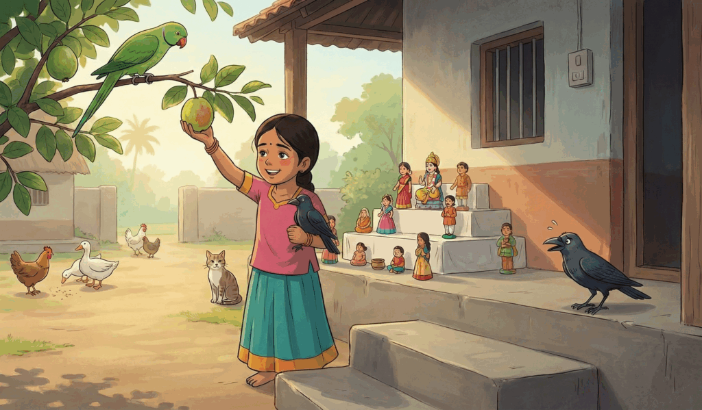 ఏడవ తరగతి చదివే కావ్య తెలివైనది. అప్పుడప్పుడు అమ్మానాన్న ఇచ్చిన డబ్బుతో బొమ్మలు కొనుక్కుని ఖాళీ ఉన్న ప్పుడు అడుకునేది. ఒకసారి కావ్య వాళ్లమ్ము పక్కింటావిడతో బొమ్మల కొలువు గురించి మాట్లాడు తుండగా అలకించింది కావ్య. కొన్ని రోజుల్లో వచ్చే దసరాకి బొమ్మల కొలువు చేయాలని, తన స్నేహితులను పిలిచి చూపించాలని అనుకుంది కావ్య. తన దగ్గర ఏయే బొమ్మ లున్నాయో చూసుకుంది. ఆ బొమ్మలు మాత్రం బొమ్మల కొలువు చేయడానికి సరిపోవని, మరిన్ని కొత్త బొమ్మలు కొనుక్కోవాలని అనుకుంది కావ్య, అంతలో బయట కాకి అరిచింది. కాకి అరుపు వినగానే పక్షులు, జంతువుల బొమ్మల్ని కూడా బొమ్మల కొలువులో పెట్టాలన్న కోరిక కలిగింది కావ్యకు. దసరా నాడు స్నేహితురాళ్లని పిలిచి బొమ్మలతో కొలువు చేర్చింది. రోజంతా ఆడుకున్నారు పిల్లలు. బాగా అలసిపోయిన కావ్య అక్కడే నిద్రపోయింది. అమ్మ వచ్చి కావ్యను ఇంటిలోపలకు తీసుకువెళ్లగా, బొమ్మలు బయట గడపలో కొలువు దగ్గరే ఉండిపోయాయి. ఆ చే తరువాత రోజు ఉదయం కావ్య చూసుకుంటే వాటిలో కాకి. బొమ్మ కనబడలేదు. అమ్మను అడిగితే తెలియదని చెప్పింది. నాన్న పని మీద వెళ్లాడు.