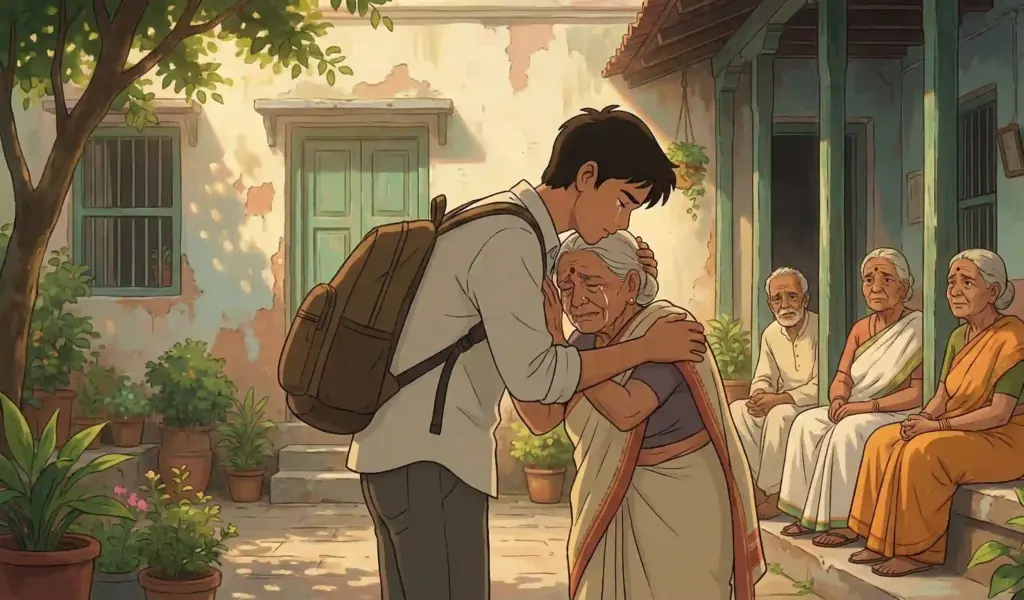రాధమ్మకి, మనవడివైపు గర్వంగా చూస్తూ మనవడి చేతిని ఇంకా గట్టిగా పట్టుకొంది రాధమ్మ. పిండాల్ని చూపిస్తూ “వీళ్లే మీ తాత ముత్తాతలు. నమస్కారం చేసుకో బాబూ” అని అన్నాడు బ్రాహ్మడు.”సమయానికి మీ మనవడు వచ్చాడు. రఘుపతిగారి ఆత్మకు శాంతి కలుగుతుంది” అని ఒక ముసలాయన అన్నాడు. భోజనాలు అయిన తరువాత రాకేష్ వెళ్తానని రాధమ్మతో చెప్పాడు. రాధమ్మ ఒప్పుకోలేదు. “అప్పుడే అమెరికా వెళ్లిపోతావా?” అంటూ కళ్లలో నీళ్ల పెట్టుకొంది. “లేదు బామ్మా! హోటల్ నుంచి నా సామాను తెచ్చుకొంటానన్నాడు రాకేష్ “సరే.. వెంటనే వచ్చేసేయి” అని ఒప్పుకుంది. రాధమ్మ, రెండు గంటల్లో సామానుతో సహా తిరిగి వచ్చాడు రాకేష్, రాధమ్మ చూపించిన ప్రేమతో రెండు రోజులు రెండు నిమిషాల్లాగా గడిచిపోయాయి. చెప్పిన ప్రకారం శ్రీనివాస్ హైదరాబాద్ వచ్చి హోటల్లో దిగి కొడుక్కి ఫోన్ చేశాడు. తండ్రి మీద బాగా కోపం వచ్చింది. రాకేష్క. వెంటనే బయలుదేరి ఇంటికి నన్చెయ్యమని నాకేష్ గట్టిగా చెప్పాడు. కొదుకు మనసు గ్రహించి వెంటనే ఇంటికి వచ్చేశాడు శ్రీనివాస్, తల్లిని చూడగానే సిగ్గుపడ్డాడు. వాధమ్మ చేసిచడానికి తల్లికి క్షమాపణలు క్షమించేసింది. చెప్పాడు. తల్లిమనను అన్నింటిని