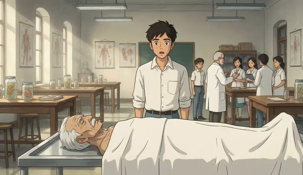 మొదట హాస్పిటల్ పర్యటన ముగించుకొని కాలేజీదారి పట్టారు సమావేశానికి వచ్చిన సభ్యులు, కాలేజీకి రాగానే ప్రిన్సిపాట్ని కలిశారు. ఆయన చాలా సంతోషంగా అందర్నీ ఆహ్వానించాడు. ప్రతి డిపార్టుమెంటు చూసుకొంటూ అనాటమీ డిపార్టుమెంటుకి వచ్చారు. అనాటమీ ప్రొఫెసర్ అప్పుడే జరుగుతున్న క్లాస్కి ఆహ్వానించాడు. అదొక పెద్ద హాల్, అక్కడ మనిషి శరీర భాగాల్ని గురించి విద్యార్థులకు వివరిస్తుంటారు. అప్పుడే ఒక మగ మనిషి దేహాన్ని గురించి ” వివరిస్తున్నారు. రాకేష్ కుతూహలంగా దగ్గరగా వెళ్లి చూశాడు. ఒక్కసారి షాక్ – అయినట్లయింది. అప్పుడే కెమికల్ లోంచి తీసారేమో… ఆ మనిషి మొహం స్పష్టంగా కనిపించింది. రాకేష్కి ఎక్కడో ఎప్పుడో చూసినట్లుంది. మొహం పరిచయంగా అనిపించింది. ఆజానుబాహువైన దేహం. పచ్చటి తెలుపు, ఎక్కడో చూశాను.. అని అనుకొన్నాడు రాకేష్, బాగా దీక్షగా చూస్తే తండ్రి శ్రీనివాస్ మొహంలా అనిపించింది. ఆ ఒడ్డూ పొడుగు అచ్చు డాడిలా ఉంది. పర్యటన అయిపోయింది. దీంతో సమావేశం కూడా పూర్తయింది. రాకేష్ మెల్లిగా అనాటమీ ప్రొఫెసర్ దగ్గరకి వెళ్లి తనని తాను పరిచయం చేసుకొన్నాడు. హైదరాబాద్ స్వస్థలం అని చెప్పగానే ప్రొఫెసర్ సంతోషంగా తానేమీ చేయగలనని అడిగాడు. “సర్, నాకు ఆ డెడ్ బాడీ గురించిన వివరాలు కావాలి”, “అదెందుకు? అయినా వివరాలు దొరకటం కష్టం” అన్నాడు ప్రొఫెసర్. “ఎట్లాగైనా ఈ సహాయం చేసిపెట్టాలి.