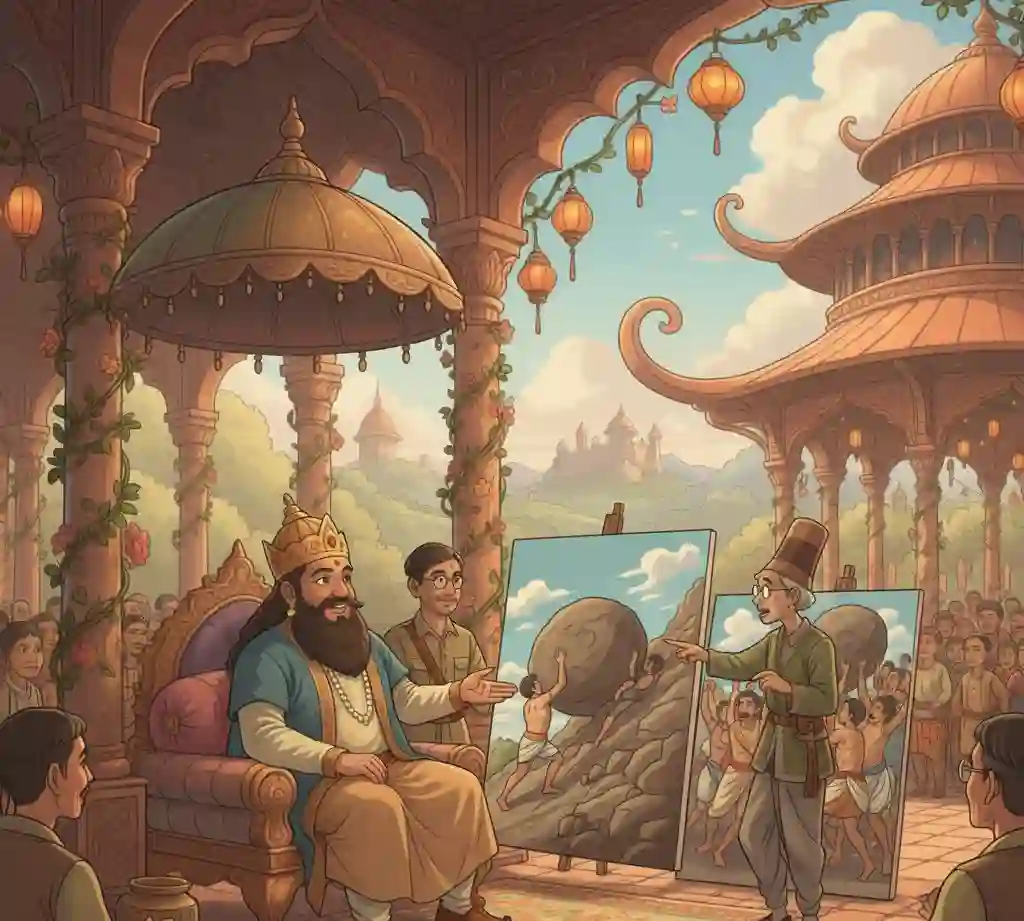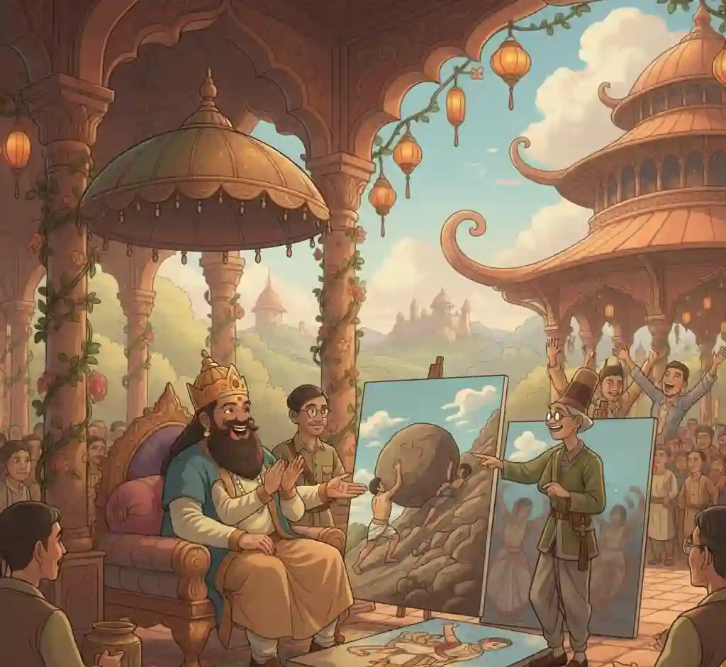 భువనగిరి రాజ్యాన్ని గుణశేఖరుడు పరిపాలిస్తుండేవాడు. అతని మంత్రి సుబుద్ధి. రాజ్యంలో ఏటా జరిగే పండుగ వేడుకలలో జరిగే పలురకాల పోటీలు నిర్వహించబడతాయి. విజేతలకు ప్రోత్సాహ బహుమతులు రాజుగారి చేతులమీదుగా ఇవ్వబడతాయి. ఆ యేడు జరిగిన చిత్రలేఖనం పోటీలలో రెండు చిత్రాలలో ఒకదానిని ఉత్తమచిత్రంగా ఎంపిక చేసే బాధ్యత మంత్రి సుబుద్ధికి అప్పగించాడు రాజు గుణశేఖరుడు. రెండు చిత్రాలను పరిశీలించిన మంత్రి సుబుద్ధి ‘ప్రభూ సంప్రదాయ నృత్యం చేస్తున్న యువతిని కడురమ్యంగా చిత్రికరించాడు చిత్రకారుడు.