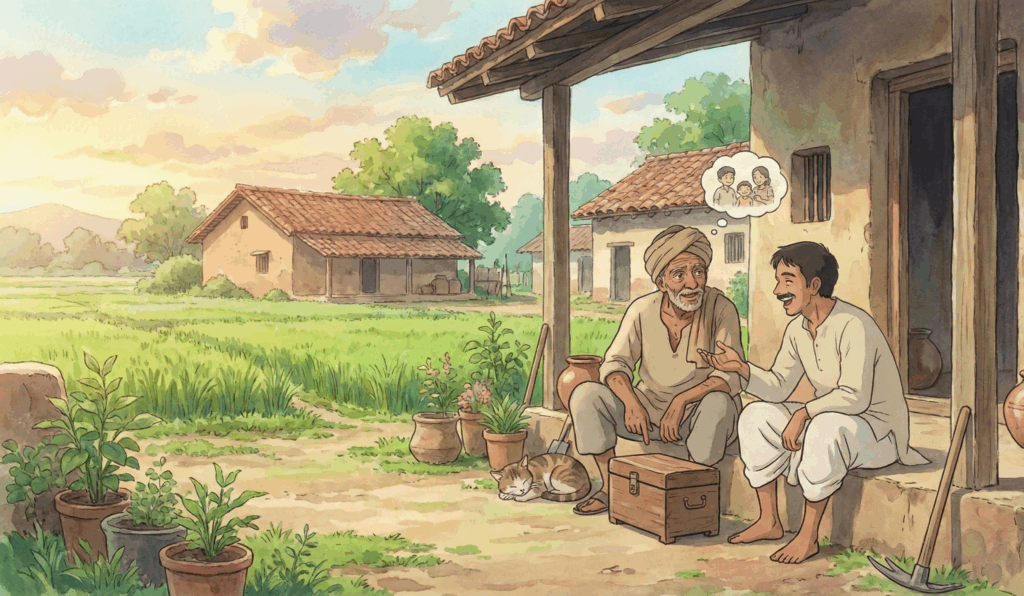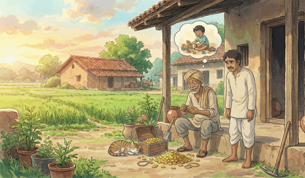 పూర్వం బండి ఎల్లయ్య అనే రైతు ఉండేవాడు. బండి ఎల్లయ్య చదువు రానివాడు. వ్యవసాయం తప్ప ఏమాత్రం లోకజ్ఞానం లేని అమా యకుడు. బండి ఎల్లయ్యకు రంగయ్యశెట్టి అనే మిత్రుడు ఉండేవాడు. రంగయ్యశెట్టి, బండి ఎల్లయ్య జరుగు-పొరుగు ఇళ్లల్లో వుండేవారు. బండి ఎల్లయ్య వ్యవసాయం మీద వచ్చిన సంపాదనను దాచి భద్రంగా ఉంచమని, పొరుగు నున్న రంగయ్యశెట్టికి ఇచ్చేవాడు. రంగయ్యవెట్టి మొదట్లో ఎల్లయ్యకు తన మీద వున్న నమ్మకాన్ని వమ్ము చెయ్యకుండా కచ్చితంగా లెక్కలు చెప్పేవాడు. అంతేకాదు, తన దగ్గర ఎల్లయ్య సంపాదనంతా వుంచి నందుకు కొంత మొత్తాన్ని అదనంగా వడ్డీ కింద ఇచ్చి ఎల్లయ్య సంపాదనను పెంచేవాడు. సంపాదనైతే పెరుగుతుంది కానీ దాన్ని ఎప్పుడూ వినియోగించుకునే వాడు కాదు ఎల్లయ్య. “నీ సంపాదనంతా లెక్కకు మించి ఎక్కువ అయిపోయింది. ఇప్పటికైనా దాన్ని తీసుకొని వినియోగించుకో. నీవు ముసలివాడివి అయి పోతే అప్పుడు నువ్వు సరదాగా ఖర్చు చేద్దామనుకు న్నా నీకు ఓపిక ఉండదు” అని హితబోధ చేసేవాడు రంగయ్యశెట్టి. “నేను సంపాదన అంతా నా పిల్లలకోసం దాచి పొదుపుగా వుంచుకుంటున్నాను. నేను ఎప్పుడు అడిగితే అప్పుడు నీ దగ్గర వున్న నా సంపాదన అంతా ఇద్దువుగానిలే. “అని రంగయ్య మీద పూర్తి నమ్మకంతో అనేవాడు ఎల్లయ్య.
