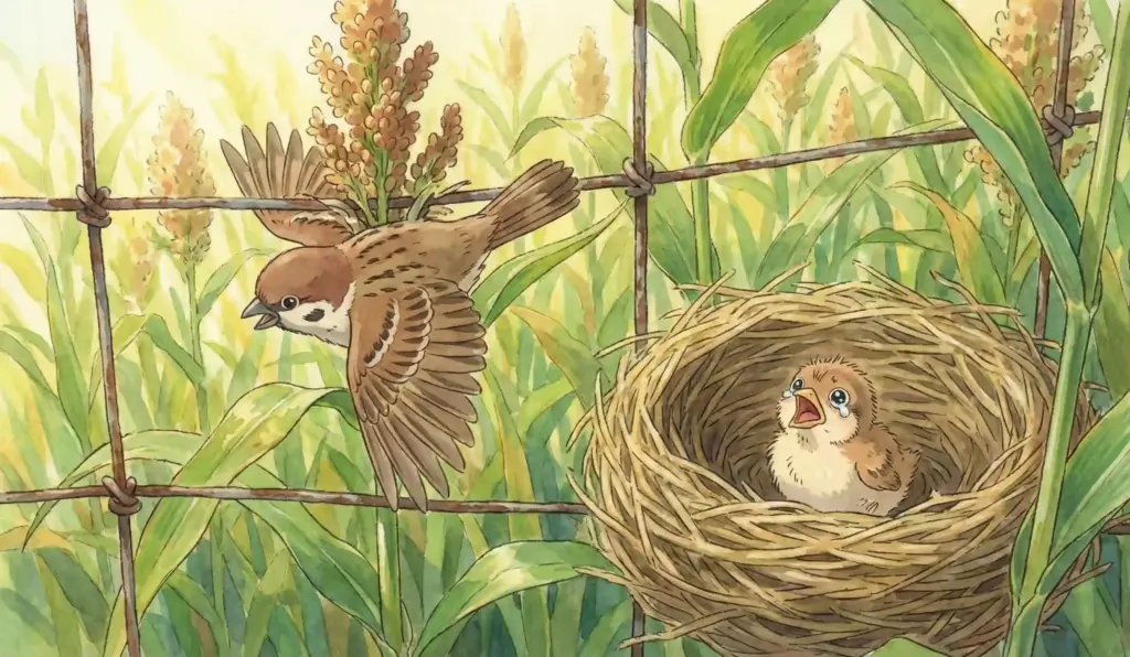 ఎగరలేని తన నిస్సహాయతను తలచుకుని తల్లిని చూస్తూ అరవ సాగింది. బిడ్డ అరుపులు విన్న పక్షి, తన శక్తిని కూడకట్టుకుని ఎగరడానికి ప్రయత్నించింది. ఎగిరే ప్రయత్నంలో రెక్క విరిగిపోయింది. విరిగిన రెక్కతో ఇంటికి చేరింది తల్లి పక్షి. రెప్పల నిండా కన్నీళ్లతో బుల్లిపిట్ట తల్లిఒడిలో చేరింది. కోత కోసేసిన భార్యాభర్తలు ఇంటికి వెళ్లిపోయారు. గింజలు లేక ఆకలితో అలాగే పడుకున్నారు. బుల్లి పిట్ట, తల్లిపక్షి.