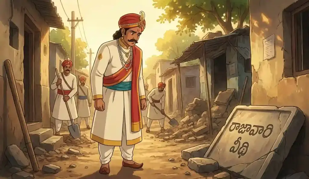నాలుగు రోజుల తరువాత “పనులు ఎలా జరుగు తున్నాయో చూసి వద్దామని” వెళ్లాడు. అక్కడ కొన్ని కూల్చివేతలు జరుగుతున్నాయి, అందులో భాగంగా వీధి మొదట్లో ఉన్న రాజావారి వీధి శిలాఫలకం విరిగి ఉంది. రాజు చాలా భావోద్వేగా నికి గురయ్యాడు.