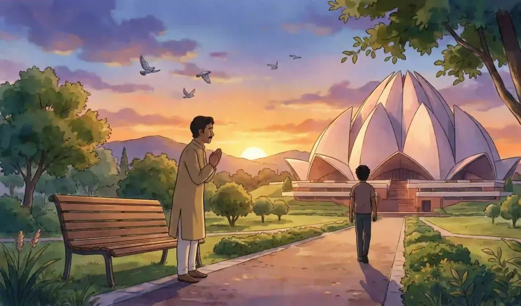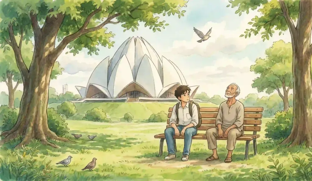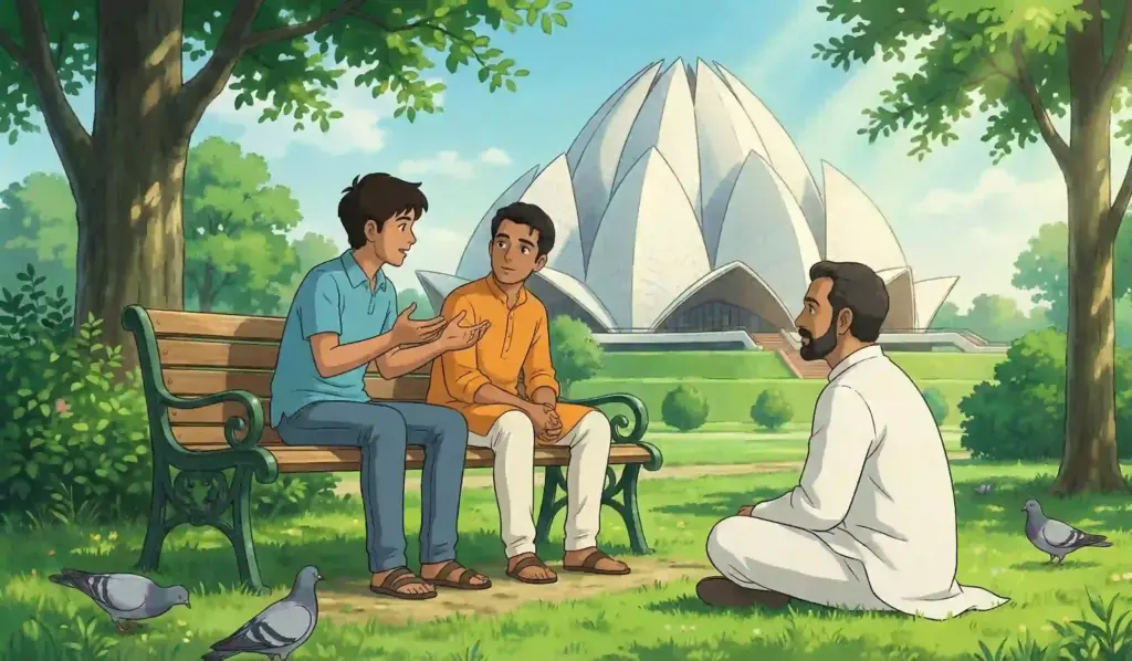 ఉదయం. లోటస్ టెంపుల్, న్యూ ఢిల్లీ. వాతావరణం చల్లగా, ఆహ్లాదంగా ఉంది. సూర్యబింబం కనిపించడం లేదు. వెలుగును బట్టి సూర్యుడి ఉనికి తెలుస్తోంది. కుల మతాలకతీతంగా ప్రార్థనలు చేసుకునే ప్రదేశం ఒకటుందని, అదీ మన దేశంలోనే గూగుల్లో సెర్చ్ చేస్తే తెలిసి ఇక్కడికి వచ్చాను. భిన్నత్వంలో ఏకత్వానికి అద్దం పడుతున్న వసుధైన కుటుంబాన్ని ప్రతిఫలింపచేస్తూ, అంత మంది కలిసిమెలిసి మౌన ప్రార్థనలు చేస్తుంటే చూడముచ్చటేసింది. ముఖ్యంగా చిన్నతనంలోనే పిల్లల్లో ఆ బీజం పడడం, ముదావహం. కళ్లు మూసుకుని ధ్యానంతో మనసును, శరీరాన్ని ఒక కేంద్ర బిందువులో లయం చేసి, తాదాత్మ్యంతో ప్రశాంతంగా లోపల కొంతసేపు గడిపి బయటకొస్తున్న నాకు ఒక వ్యక్తి కనిపించాడు. అతనికి సుమారు ముప్ఫై ఏళ్లుంటాయి. కళ్లల్లో, ముఖంలో నేనెవరిలోనూ, ఎన్నడూ చూడనంత ప్రశాంతత ద్యోతకమవుతోంది. అతన్నెందుకో పలకరించాలనిపించింది. బహుశా అతని ముఖం చూడగానే నా మనసులో “మన ప్రాంతం వాడే” అన్న భావం కూడా కదలాడినందుకేమో? అతను కొంత దూరం నడిచి, పచ్చికబయల్లో కూర్చున్నాడు. నేను అతనికి దగ్గరగా వెళ్లి కూర్చున్నాను. నన్ను చూసి నవ్వాడు. కాసేపు అక్కడున్న పచ్చదనాన్ని, పక్షుల కిలకిలలను ఆస్వాదించి, “మీరు తెలుగువారు కదూ..!” అన్నాను. అవునన్నట్టుగా చిరునవ్వు నవ్వాడు. “నా పేరు విశిష్ట్.