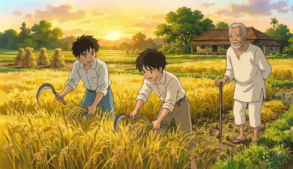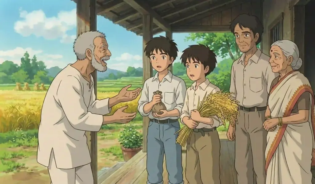కొంతకాలానికి కాశీ వెళ్లిన తల్లి, తండ్రి తిరిగి రావడంతో అన్నదమ్ములు ఎంతో సంతోషించారు. ఒకరోజు సుబ్బయ్య మామయ్య తమ ఇంటికి రావడంతో ‘మామయ్య ఇప్పటికీ పొలమంతా మూడుసార్లు దున్ని చదును చేసాము కాని మాకు పొలంలో దాగిన నిధి కనిపించలేదే అన్నారు.పక్కున నవ్విన మామయ్య ‘అల్లుళ్లు మిమ్మల్ని శ్రమజీవులుగా మార్చడానికి నేను మీ తండ్రి ఆడిన నాటకం అది. సంవత్సరకాలంలో ఇంతధనం సంపాదించారంటే మీ జీవితకాలంలో ఎంతో సంపాదిస్తారు ఇలానే వ్యవసాయం చేసుకుని వృద్ధిలోనికి రండి’ అని ఆశీర్వదించాడు సుబ్బయ్య మామ.