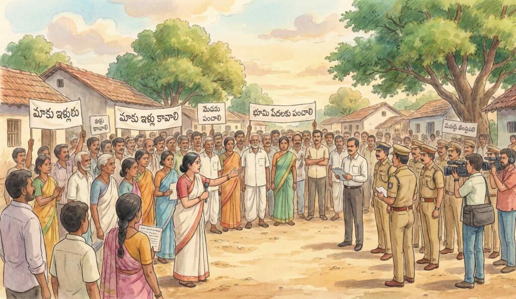 “బాంబే ఆవాస్, ఇందిరా ఆవాస్, ప్రధాని ఆవాస్ యోజన పథకాల కింద ఎన్ని ఇళ్లు, ఎన్ని పట్టాలు ఎంత మందికి 3 లక్షల నగదు ఇచ్చారు?” అని ప్రశ్నించాడు శ్యామ్. “దళితులకిచ్చి వాగ్దానాలు ఏమైనాయి?” అంది లక్ష్మమ్మ.