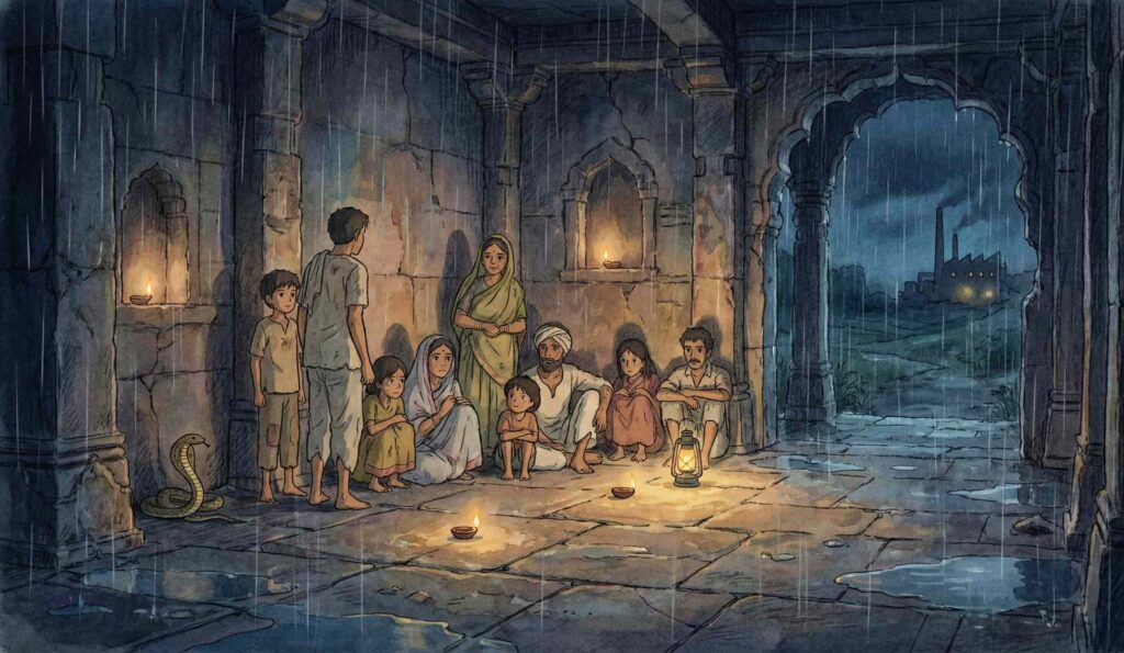 కొందరు సమీపంలోని పాత కమ్యూనిటీ హాలు వైపుకు, కొందరు పాడుబడ్డ ఆ శివాలయంలోకి చేరి తల దాచుకున్నారు. సగం కూలిన లాజరస్ షెడ్డు ఇంట్లోకి చేరారు శర్మ, సలీం. శాస్త్రీలు, “పట్నంబాబులు.. ఇక్కడ మీరు ఉండలేరు బాబు.