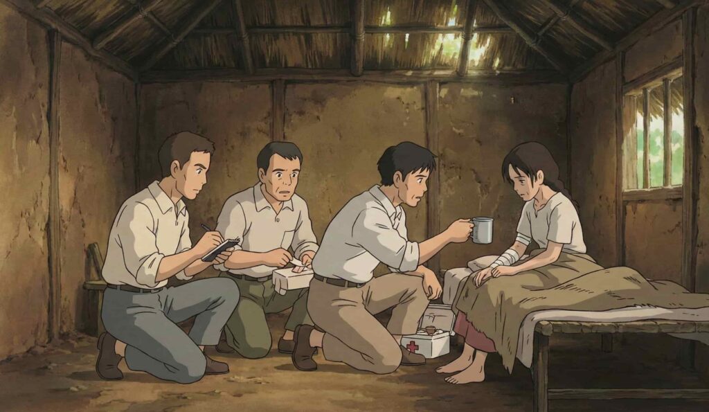 మీరు వెళ్లి ఎమ్ఎ౦కు చెప్పండి” అన్నాడు సలీం. గుడిసెలో మూలుగు వినిపించడంతో ఆందోళనగా ముగ్గురూ ఆ గుడిసె దగ్గరకు వెళ్లారు. చినిగిన బట్టలతో… రక్తం మడుగులో నలభై యేండ్ల స్త్రీ రోదిస్తోంది. ముగ్గురికి ఆమె స్థితి అర్థమైంది. ఆమెకు ఫస్ట్ ఎయిడ్ చేసి నీళ్లు తాగించారు.
