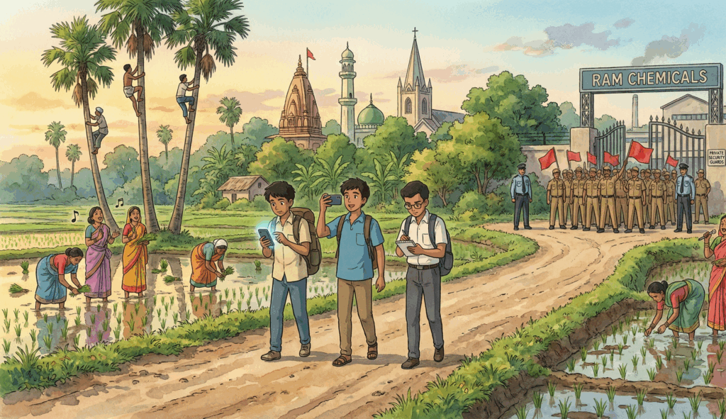 శర్మా, సలీం లేవండిరా! అంటూ బ్యాగ్స్ తీసుకొని గబగబా బస్సు దిగారు. గూగుల్ మ్యాప్లో లొద్దిపల్లి స్మార్ట్ ఫోనులో సెర్చి చేస్తూ డొంకరోడ్డు వెంబడి నడకను సాగించారు శ్యామ్, శర్మ, సలీంలు. బురదనీటిలో మహిళా వ్యవసాయ కూలీల తల్లులు నడుం వంచి జానపద గీతాలు ఆలపిస్తూ నాట్లు వేస్తున్నారు.