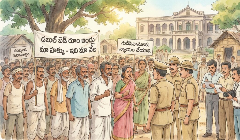 “లక్షల మంది పేదలు గుడిసెలు వేసుకొని ఉన్నారు. డబుల్ బెడ్ రూం ఇండ్లు కట్టించాలి” అన్నాడు. నాగయ్య. “ఇంటి సౌకర్యం జీవించే హక్కులో భాగం” అంటూ ఢిల్లీ హైకోర్టు తీర్పును గుర్తు చేసాడు రాములు. “గౌరవప్రదంగా ఇంటి సౌకర్యంతో జీవించే హక్కు పేదలకు ఉంది” అన్నారు శ్యామ్, సలీం, శాస్త్రీలు.