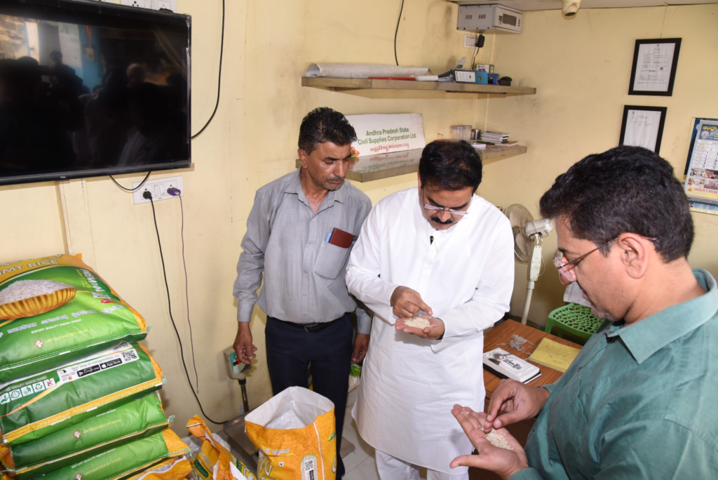 అమ్మే బియ్యం లో నాణ్యత లేదు. 26 కేజీల బియ్యం బస్తా 25 కేజీలు మాత్రమే ఉంది. వేయింగ్ మిషన్ సైతం సరిగా పనిచేయడం లేదన్నారు. 26 కేజీల బియ్యం బస్తాను మంత్రి నాదెండ్ల మనోహర్ చెక్ చేశారు.బియ్యంలో నూకల శాతం ఎక్కువగా ఉందని మంత్రి నాదెండ్ల మనోహర్ గమనించారు. ఈ సందర్భంగా నెలలోగా ఏపీ పౌర సరఫరాల శాఖ తరపున రేషన్ స్టోర్ ను ఏర్పాటు చేసేలా చర్యలు తీసుకుంటాం తెలిపారు. నాణ్యమైన బియ్యంతో పాటు, సరుకులను అందిస్తాం అని ఏపీ పౌరసరఫరాల శాఖ మంత్రి నాదెండ్ల మనోహర్ తెలిపారు.
