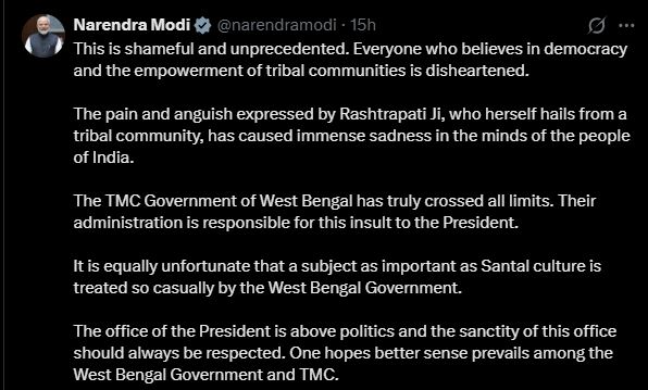 West Bengal: పశ్చిమ బెంగాల్ పర్యటనకు వచ్చిన రాష్ట్రపతి ద్రౌపది ముర్ము పట్ల అక్కడి మమతా బెనర్జీ ప్రభుత్వం వ్యవహరించిన తీరుపై ప్రధానమంత్రి నరేంద్ర మోదీ తీవ్రంగా స్పందించారు. రాష్ట్రపతి పర్యటనలో కనీస ప్రోటోకాల్ పాటించకపోవడంపై ఆయన మండిపడ్డారు. మమతా బెనర్జీ ప్రభుత్వం అన్ని హద్దులు దాటి ప్రవర్తించిందని, ఇది ప్రజాస్వామ్యానికి గొడ్డలిపెట్టు అని విమర్శించారు.
