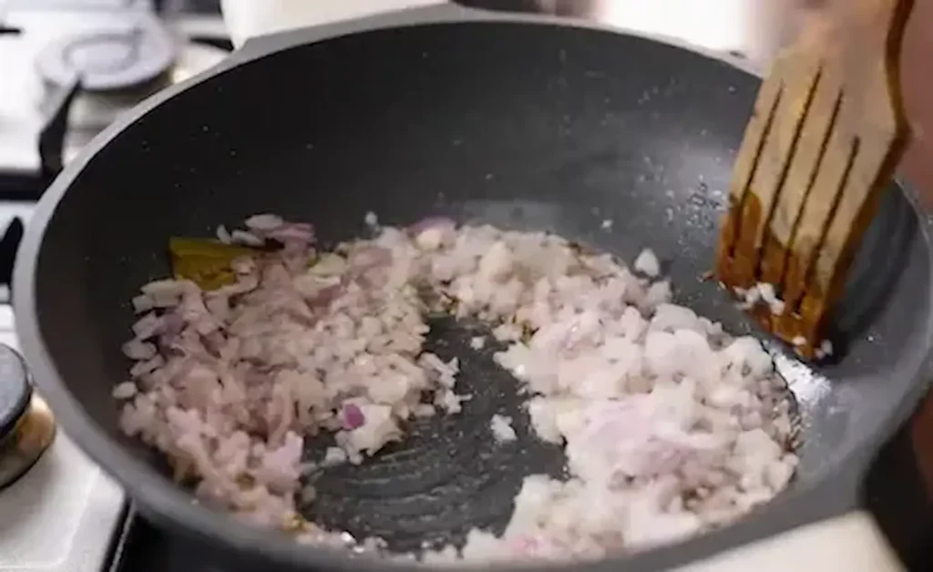 స్టవ్ మీద మందపాటి గిన్నె పెట్టి రెండు టేబుల్ స్పూన్ల నెయ్యి వేసి వేడయ్యాక, టీస్పూన్ సాజీరా, రెండు యాలకులు, నాలుగు లవంగాలు, మరాఠి మొగ్గ, దాల్చినచెక్క ముక్కలు, రెండు బిర్యానీ ఆకులు వేసి వేగించాలి. తరువాత సన్నగా తరిగిన ఉల్లిపాయ(onion)ముక్కలు వేసి బాగా వేయించాలి. అప్పుడు మునుపు నానబెట్టిన మీలేమేకర్ మిశ్రమాన్ని వేసి, అరగ్లాసు నీళ్లు పోసి సన్నని మంటపై రెండు నిమిషాల పాటు ఉడికించాలి.