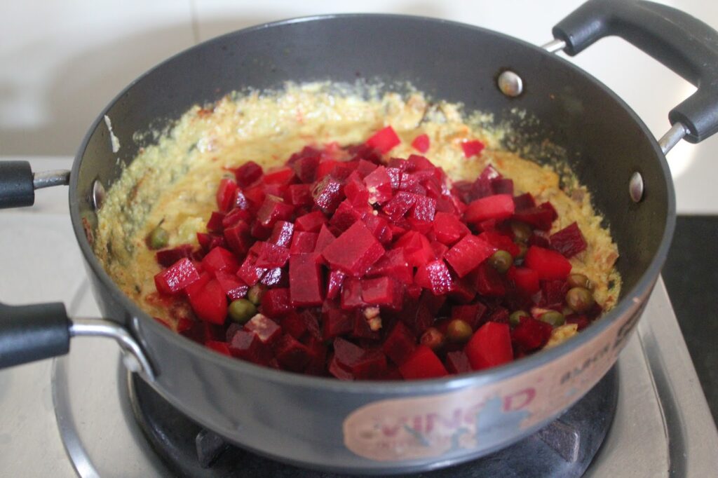 ముందుగా ఒక కప్పు నీళ్లు పోసి బీట్రూట్ ముక్కలను సన్నని మంటపై 10 నిమిషాల పాటు ఉడికించి పక్కన పెట్టుకోవాలి. స్టవ్ మీద కడాయి పెట్టి నూనె వేసి వేడయ్యాక ఆవాలు, జీలకర్ర, కరివేపాకు, తరిగిన ఉల్లిపాయలు, పచ్చిమిర్చి వేసి బాగా వేయించాలి.అవి బాగా వేగిన తర్వాత అల్లం వెల్లుల్లి పేస్ట్, పసుపు, కారం, ఉప్పు, గరం మసాలా వేసి మరో 2 నిమిషాల పాటు వేయించాలి.తర్వాత అందులో ఉడికించిన బీట్రూట్ ముక్కలు వేసి మరో 5 నిమిషాల పాటు సన్నని మంటపై ఉడికించాలి.స్టవ్ ఆఫ్కు చేసి, చివరగా బాగా చిలికిన పెరుగు వేసి చక్కగా కలిపితే రుచికరమైన బీట్రూట్ కుర్మా సిద్ధం!