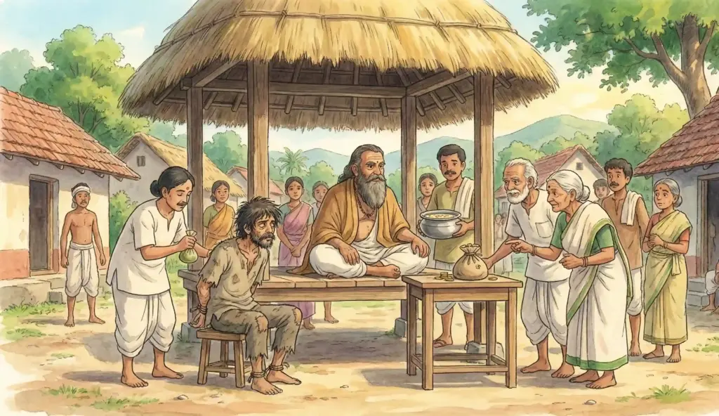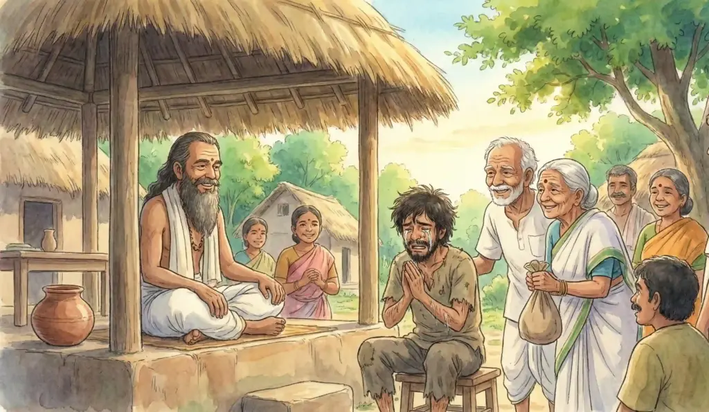 రామాపురం గ్రామంలో రామయ్య, సీతమ్మ అనే దంపతులు ఉండేవారు. ఎవరు ఏది అడిగినా వాళ్లు దనేవారు కాదు. దానం చేసి చేసి వారు పేదవారయ్యారు. తమ కొడుకు ఉన్నత చదువుల కోసం తమకు మిగిలిన ఒకే ఒక్క ఎకరం పొలం అమ్మి ఆ డబ్బును తమ ఇంట్లోనే పెట్టుకున్నారు. ఆ రాత్రి వారు పాయసం చేసుకొని తాగారు. మిగిలిన పాయసం అలాగే ఉంచి వారు. నిద్రపోయారు. వారి దురదృష్టంకొద్దీ ఆ రాత్రి ఒక దొంగ వారి ఇంట్లో ప్రవేశించి తమ కొడుకు కోసం దాచుకున్న డబ్బును తీసుకొని, ఆకలితో ఉన్నం దున పాయసం తాగి పరారయ్యాడు. తెల్లవారి లేచి చూసి జరిగినదానికి రామయ్య, సీతమ్మ ఎంతో బాధపడ్డారు. ఇలా ఉండగా ఆ పాయసాన్ని తాగి డబ్బులతో పరారైన దొంగ వాంతులు చేసుకుని ఊరి బయట ఒక చెట్టుకింద స్పృహ తప్పి పడిపోయాడు. గ్రామస్తులు ఎవరో ఉదయాన్నే అతనిని గమనించి ఆ సంగతి గ్రామపెద్దకు చేరవేశారు.