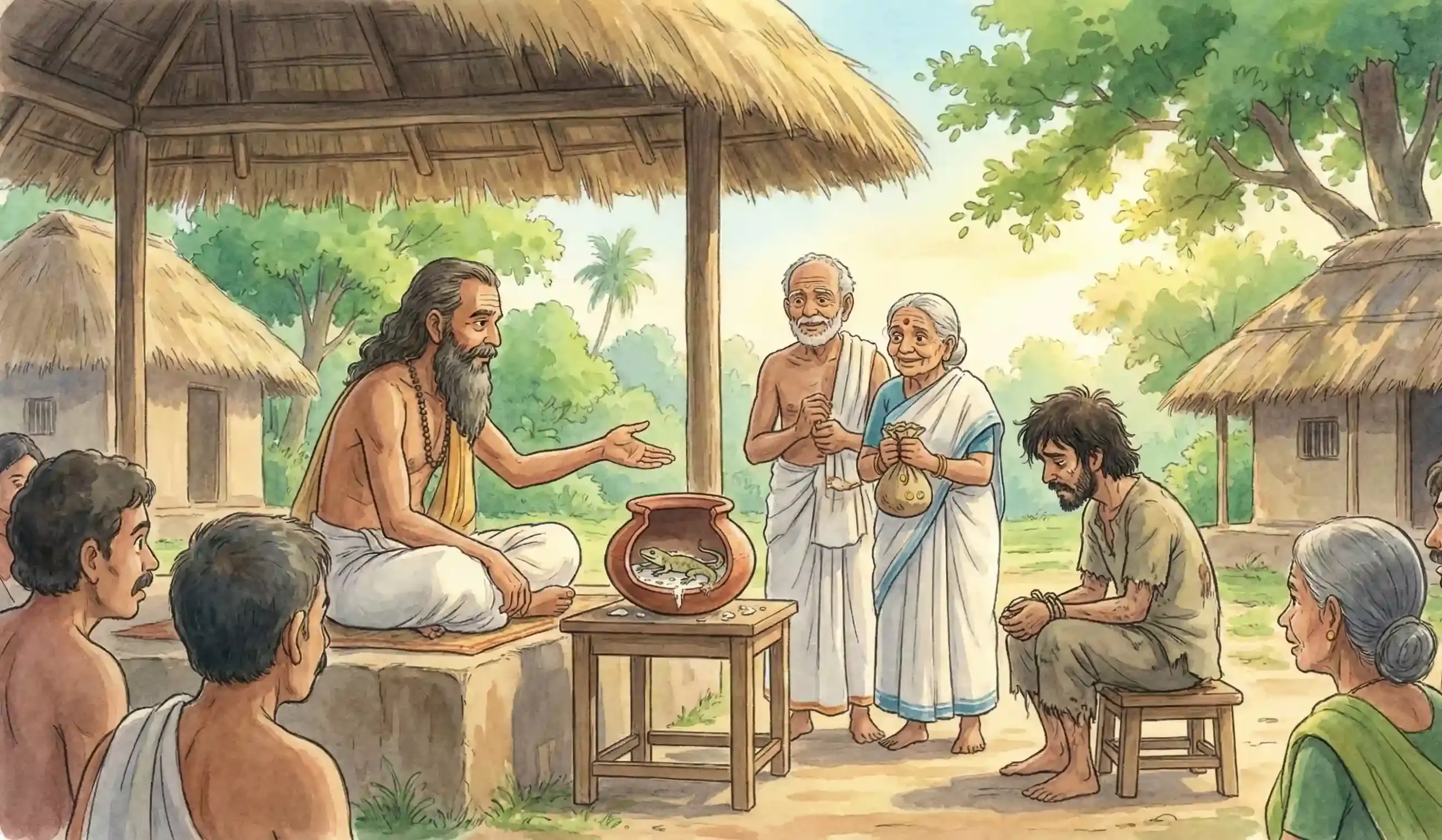 అందులో ఒక బల్లి చచ్చిపడి ఉండటం చూసి గ్రామ పెద్ద జరిగిన విషయం గ్రహించాడు. ఆ చీకట్లో దొంగ దాన్ని చూప లేదని గ్రామపెద్ద నిర్ధారణకు వచ్చాడు. కావల్సిందేముంది?” అని అన్నాడు. గ్రామపెద్ద రామయ్య, సీతమ్మ డబ్బులు వారికి ఇచ్చి, కోలుకున్న దొంగను గట్టిగా మందలించాడు. ఆ తర్వాత గ్రామపెద్ద సీతమ్మ దంపతులతో “మీరు ఇతరులకు ఉపకారం చేసారు. అందుకే ఈ గజదొంగ