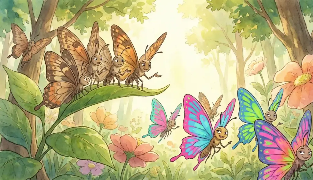 ఆధునిక పద్ధతుల్ని మేం అనుసరిస్తేనే మాకు మనుగడ’ అని పిల్ల సీతాకోకచిలుకలు ఎదురుతిరిగాయి. అయినా పెద్దతరం సీతాకోక చిలుకలు అన్నిటినీ కూర్చోబెట్టి ఇలా హితబోధ చేశాయి. ‘అందరూ – అసహించ్యుకునే గొంగళి పురుగుల నుంచి మనం అందమైన జీవాలుగా మారాము. ప్రకృతి మనకు ఇచ్చినన్ని అందాలు వేరే కీటకాలకు ఇవ్వలేదు. సహజంగా ఉండక కృత్రిమ రంగులను ఎందుకు ఆశ్రయిస్తారు? మనం మనంగా ఉందాం. మనుషు లను అనుకరించాల్సిన అవసరం లేదు. వారి జీవన విధానం మనది వేరువేరే’ అని. ఆ మాటలను పిల్ల సీతాకోక చిలుకలు చెవిన వేసుకోలేదు. ‘మనం అందంగా తయారవుతున్నామని వాళ్లకు కుళ్లు. అందుకే అడుగడుగునా అడ్డు పడుతున్నారు’ అని తిట్టుకున్నాయి. ‘ఎలాగూ పెద్దలకు తెలిసిపోయింది కదా’ అని రోజుకో కొత్తరకం రంగులేసుకుని ఊరేగేవి.