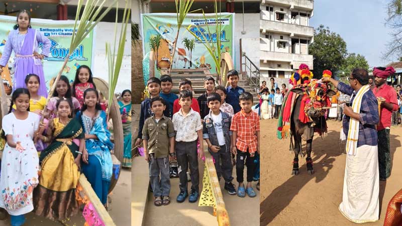 సత్తుపల్లి పట్టణంలోని సత్తుపల్లి విద్యాలయం (శ్రీ చైతన్య స్కూల్ )లో సంక్రాంతి సంబరాలు అంబరాన్ని తాకాయి. తెలుగు సంస్కృతి, సంప్రదాయాలకు ప్రతిబింబంగా నిలిచే ఈ పండుగను పురస్కరించుకుని పాఠశాల యాజమాన్యం ప్రత్యేక ఏర్పాట్లు చేసింది. విద్యార్థులకు మన సంప్రదాయాల పట్ల అవగాహన కల్పించడమే లక్ష్యంగా నిర్వహించిన ఈ వేడుకల్లో చిన్నారులు గ్రామీణ వాతావరణాన్ని ప్రతిబింబించేలా సంప్రదాయ దుస్తుల్లో మెరిసిపోయారు. భోగి మంటలు, గంగిరెద్దుల ఆటలు, హరిదాసుల కీర్తనలతో పాఠశాల ఆవరణమంతా ఒక మినీ పల్లెటూరును తలపించింది. అంబరాన్ని తాకిన ఈ సంబరాలు విద్యార్థుల్లో కొత్త ఉత్సాహాన్ని నింపాయి.