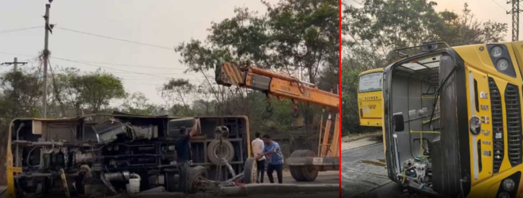 తెలంగాణ (TG Crime) లోని, రంగారెడ్డి జిల్లా మొయినాబాద్ మున్సిపల్ పరిధిలోని మృగవని పార్కు వద్ద హైదరాబాద్ స్కూల్ ఆఫ్ ఎక్స్లెన్స్ స్కూలుకు చెందిన బస్సు బోల్తా పడింది..ఈ ఘటనకు సంబంధించిన వివరాలు ఇలా ఉన్నాయి. బండ్లగూడ జాగీర్ లోని హైదరాబాద్ స్కూల్ ఆఫ్ ఎక్లెన్స్ స్కూలుకు చెందిన టీజీ 07వీ 2935 గల బస్సు హైదరాబాద్ నుంచి మొయినాబాద్ వెళ్తున్న సమయంలో మృగావని పార్కు వద్ద చేరుకోగా.. ముందున్న వాహనాన్ని తప్పించే ప్రయత్నంలో బస్సు ప్రమాదానికి గురైంది.